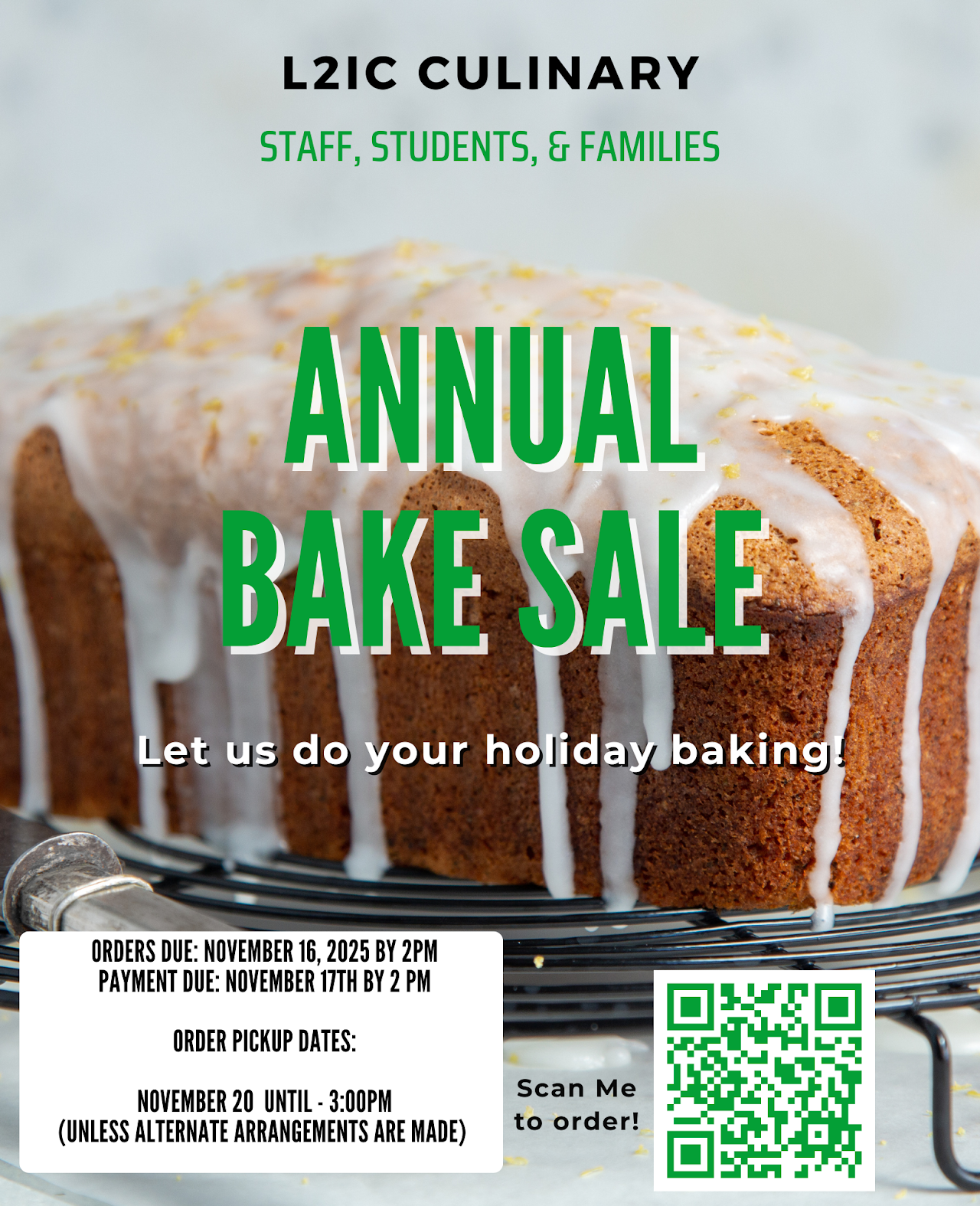 The team’s Annual Culinary Arts Holiday Bake Sale is back. All goods are baked from scratch, ready to eat or for you to slide into the oven on Thanksgiving Day.